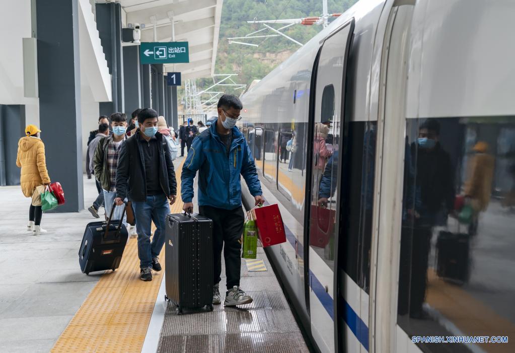 KUNMING, 29 enero, 2022 (Xinhua) -- Imagen del 28 de enero de 2022 de pasajeros abordando un tren en la estación de ferrocarriles de Xiaowandong, en el municipio de Xiaowandong, en el distrito autónomo de la etnia yi de Nanjian, en la provincia de Yunnan, en el suroeste de China. Ubicada en la cuenca del río Lancang, en el municipio de Xiaowandong del distrito autónomo de la etnia yi de Nanjian, la estación de ferrocarril de Xiaowandong se encuentra a unos 80 kilómetros del centro de Nanjian. La estación mejora la conveniencia de transporte en el área e impulsa la vitalidad rural. Fue puesta en operación el pasado noviembre. En 2022, la estación servirá a pasajeros durante el frenesí de viajes por el Festival de Primavera por primera vez. (Xinhua/Chen Xinbo)