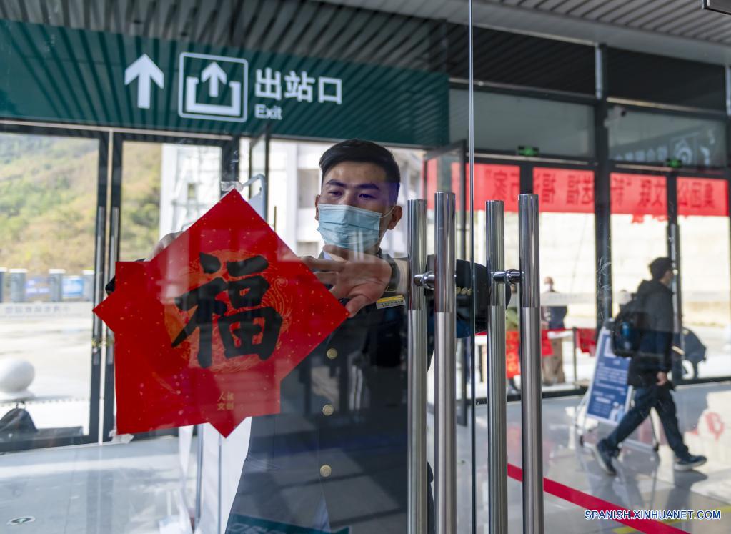 KUNMING, 29 enero, 2022 (Xinhua) -- Imagen del 28 de enero de 2022 de un empleado adornando una ventana con decoraciones del Festival de Primavera en la estación de ferrocarriles de Xiaowandong, en el municipio de Xiaowandong, en el distrito autónomo de la etnia yi de Nanjian, en la provincia de Yunnan, en el suroeste de China. Ubicada en la cuenca del río Lancang, en el municipio de Xiaowandong del distrito autónomo de la etnia yi de Nanjian, la estación de ferrocarril de Xiaowandong se encuentra a unos 80 kilómetros del centro de Nanjian. La estación mejora la conveniencia de transporte en el área e impulsa la vitalidad rural. Fue puesta en operación el pasado noviembre. En 2022, la estación servirá a pasajeros durante el frenesí de viajes por el Festival de Primavera por primera vez. (Xinhua/Chen Xinbo)