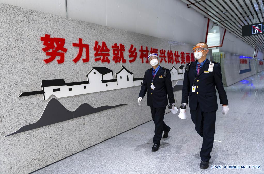 KUNMING, 29 enero, 2022 (Xinhua) -- Imagen del 28 de enero de 2022 de empleados trabajando en la estación de ferrocarriles de Xiaowandong, en el municipio de Xiaowandong, en el distrito autónomo de la etnia yi de Nanjian, en la provincia de Yunnan, en el suroeste de China. Ubicada en la cuenca del río Lancang, en el municipio de Xiaowandong del distrito autónomo de la etnia yi de Nanjian, la estación de ferrocarril de Xiaowandong se encuentra a unos 80 kilómetros del centro de Nanjian. La estación mejora la conveniencia de transporte en el área e impulsa la vitalidad rural. Fue puesta en operación el pasado noviembre. En 2022, la estación servirá a pasajeros durante el frenesí de viajes por el Festival de Primavera por primera vez. (Xinhua/Chen Xinbo)