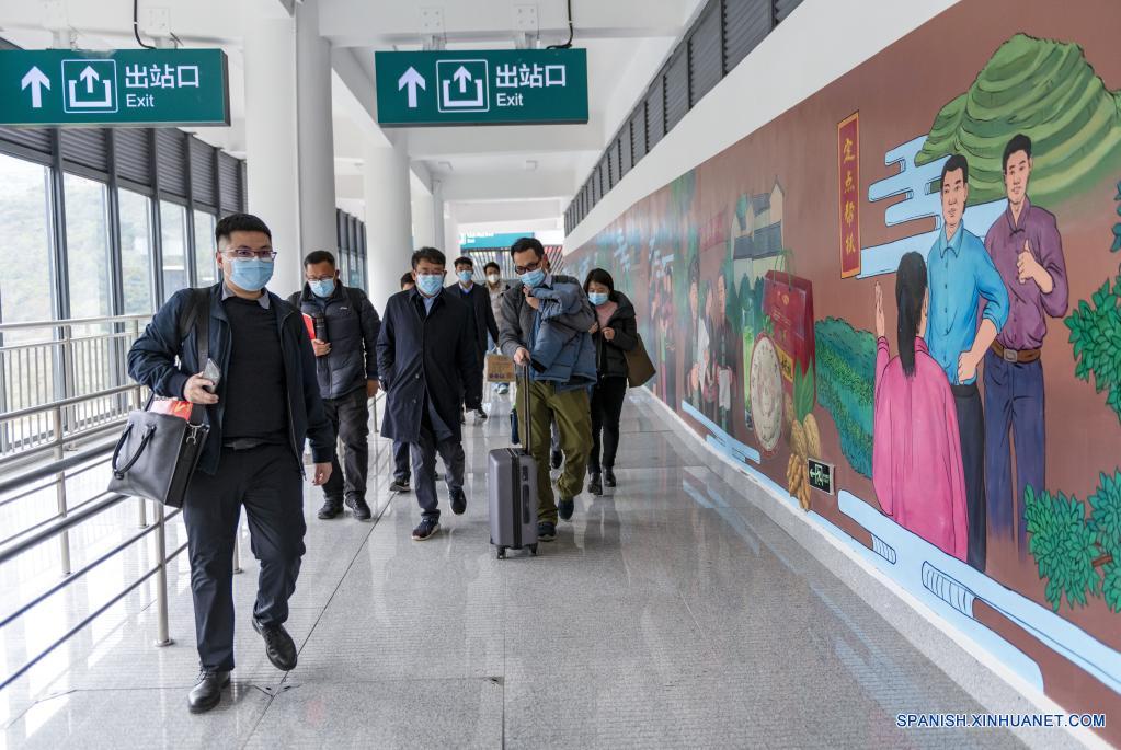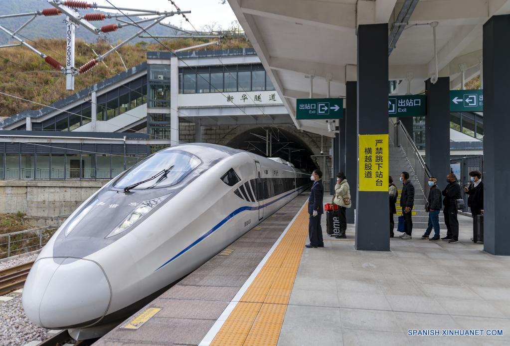 KUNMING, 29 enero, 2022 (Xinhua) -- Imagen del 28 de enero de 2022 de pasajeros esperando para abordar un tren en la estación de ferrocarriles de Xiaowandong, en el municipio de Xiaowandong, en el distrito autónomo de la etnia yi de Nanjian, en la provincia de Yunnan, en el suroeste de China. Ubicada en la cuenca del río Lancang, en el municipio de Xiaowandong del distrito autónomo de la etnia yi de Nanjian, la estación de ferrocarril de Xiaowandong se encuentra a unos 80 kilómetros del centro de Nanjian. La estación mejora la conveniencia de transporte en el área e impulsa la vitalidad rural. Fue puesta en operación el pasado noviembre. En 2022, la estación servirá a pasajeros durante el frenesí de viajes por el Festival de Primavera por primera vez. (Xinhua/Chen Xinbo)