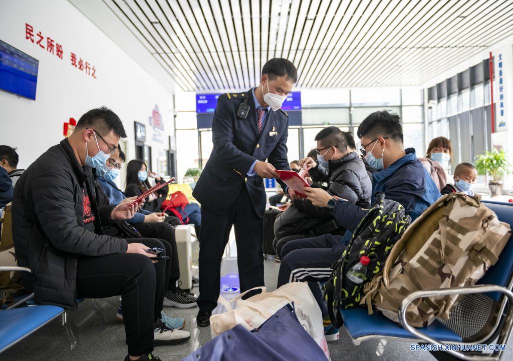 KUNMING, 29 enero, 2022 (Xinhua) -- Imagen del 28 de enero de 2022 de un empleado guiando a los pasajeros para abordar un tren en la estación de ferrocarriles de Xiaowandong, en el municipio de Xiaowandong, en el distrito autónomo de la etnia yi de Nanjian, en la provincia de Yunnan, en el suroeste de China. Ubicada en la cuenca del río Lancang, en el municipio de Xiaowandong del distrito autónomo de la etnia yi de Nanjian, la estación de ferrocarril de Xiaowandong se encuentra a unos 80 kilómetros del centro de Nanjian. La estación mejora la conveniencia de transporte en el área e impulsa la vitalidad rural. Fue puesta en operación el pasado noviembre. En 2022, la estación servirá a pasajeros durante el frenesí de viajes por el Festival de Primavera por primera vez. (Xinhua/Chen Xinbo)
