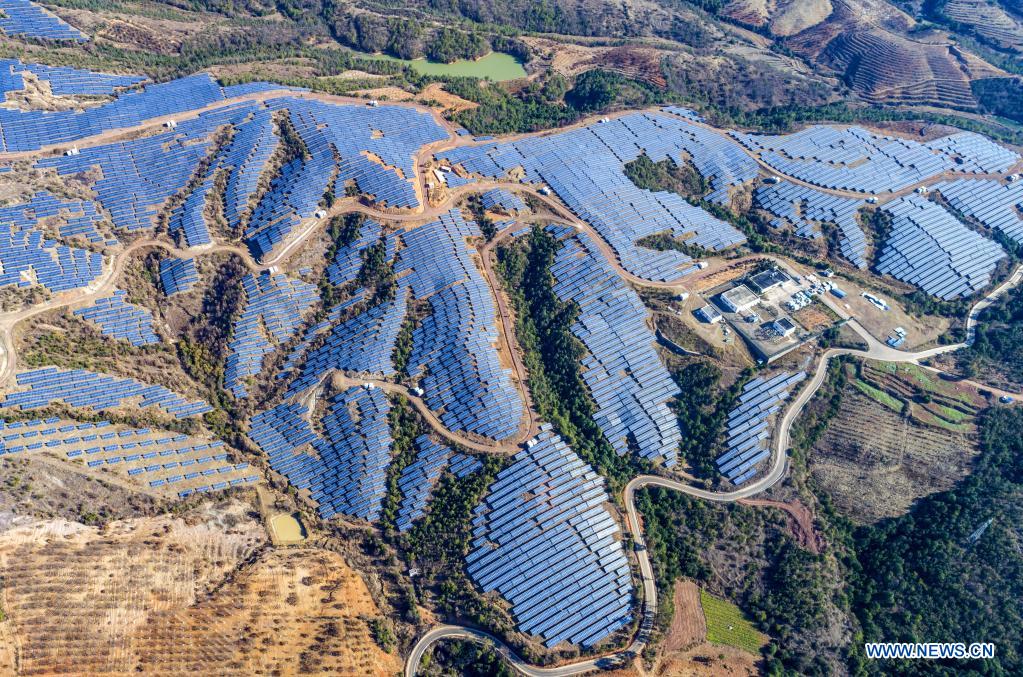 KUNMING, 17 febrero, 2022 (Xinhua) -- Vista aérea del 16 de febrero de 2022 de una estación de energía fotovoltaica, en el distrito de Yongren de la prefectura autónoma de la etnia yi de Chuxiong, en provincia de Yunnan, en el suroeste de China. Aprovechando la riqueza de sus recursos de energía solar, el distrito de Yongren ha invitado empresas a construir estaciones de energía fotovoltaica, ayudando a crear empleos y aumentar los ingresos de los aldeanos locales. hasta este momento, se han construido más de 112 estaciones fotovoltaicas en todo el distrito, logrando un valor total de producción de 1.600 millones de yuanes (aproximadamente 252.640.000 de dólares). (Xinhua/Chen Xinbo)