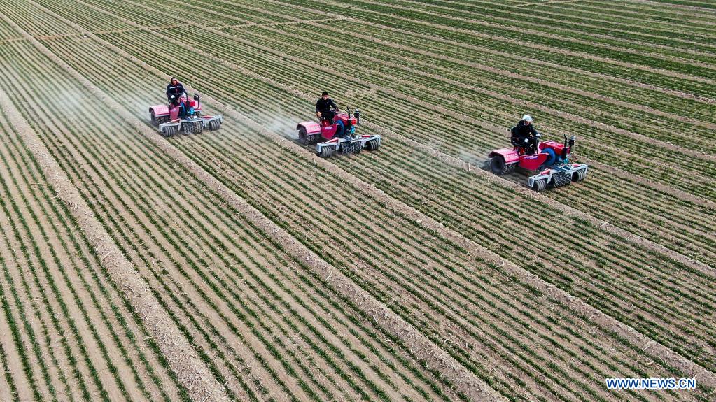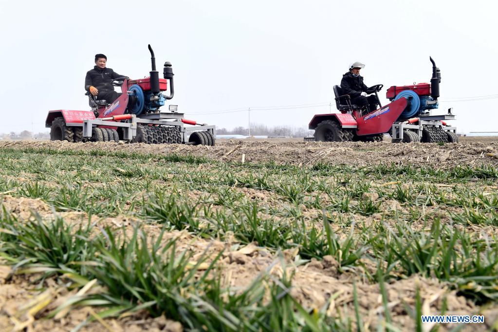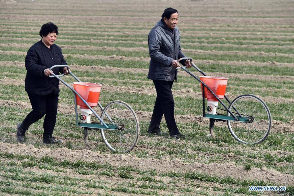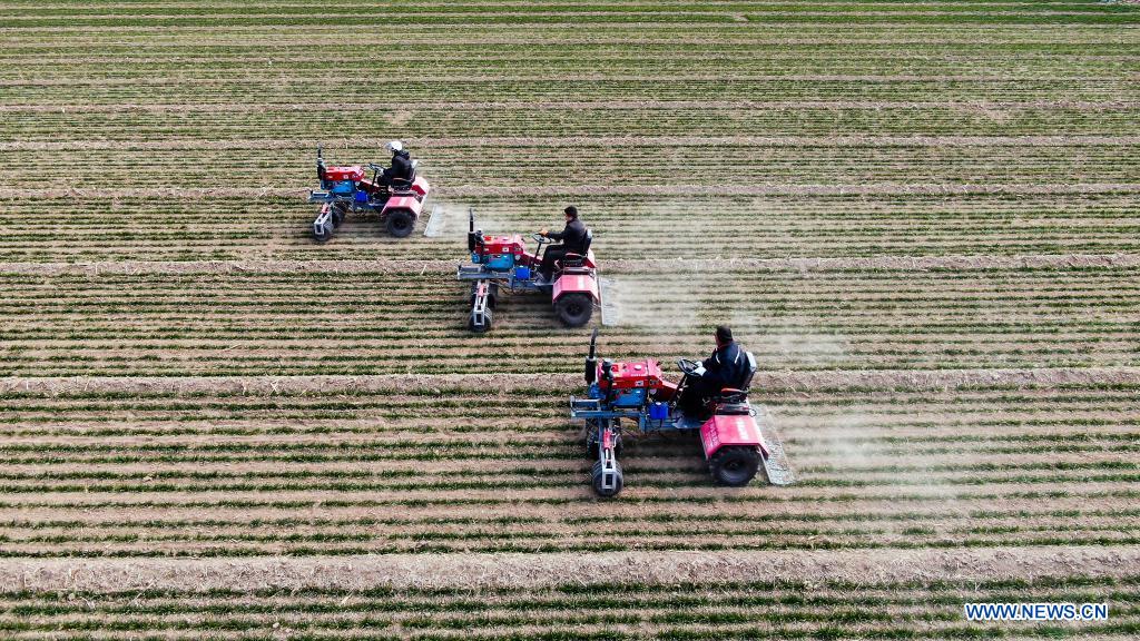 ?JINAN, 18 febrero, 2022 (Xinhua) -- Imagen del 17 de febrero de 2022 de agricultores trabajando en un campo de trigo, en el distrito de Shenxian, en la ciudad de Liaocheng, en la provincia de Shandong, en el este de China. (Xinhua/Guo Xulei)