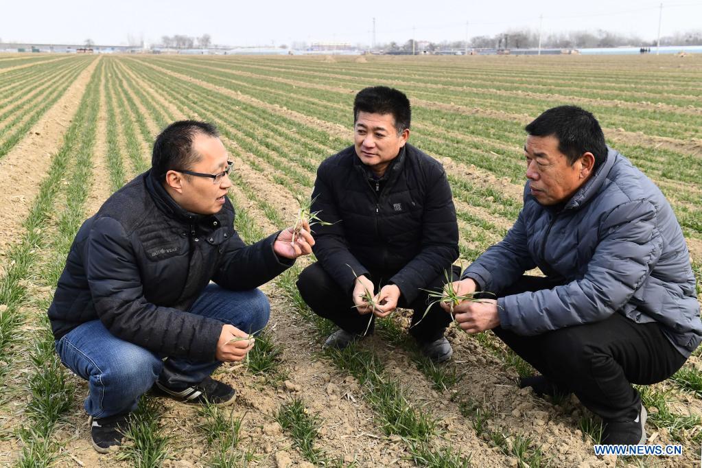 JINAN, 18 febrero, 2022 (Xinhua) -- Imagen del 17 de febrero de 2022 del técnico agrícola Li Zhe (i) ense?ando a los agricultores sobre el conocimiento de las plántulas de trigo, en el distrito de Shenxian, en la ciudad de Liaocheng, en la provincia de Shandong, en el este de China. (Xinhua/Guo Xulei)