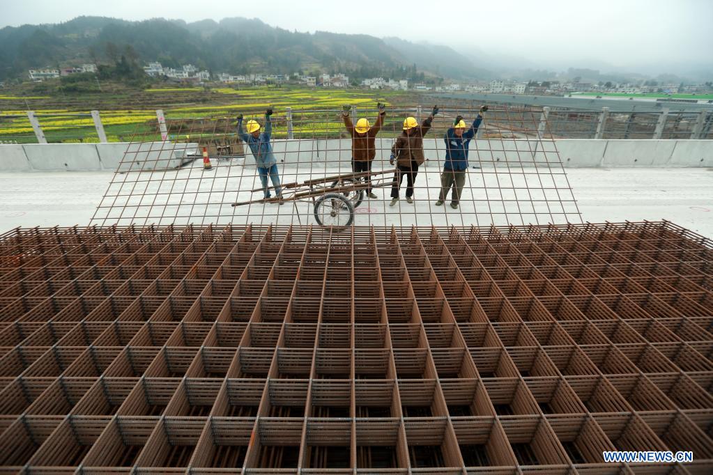 ?QIANNAN, 7 marzo, 2022 (Xinhua) -- Imagen del 6 de marzo de 2022 de trabajadores laborando en el sitio de construcción del ferrocarril de alta velocidad Guiyang-Nanning, en la provincia de Guizhou, en el suroeste de China. El ferrocarril de alta velocidad uniendo Guiyang, en la provincia de Guizhou y Nanning, en la región autónoma de la etnia zhuang de Guangxi, en el sur de China, está dise?ado para alcanzar una velocidad máxima de 350 kilómetros por hora. (Xinhua/Xiao Wei)