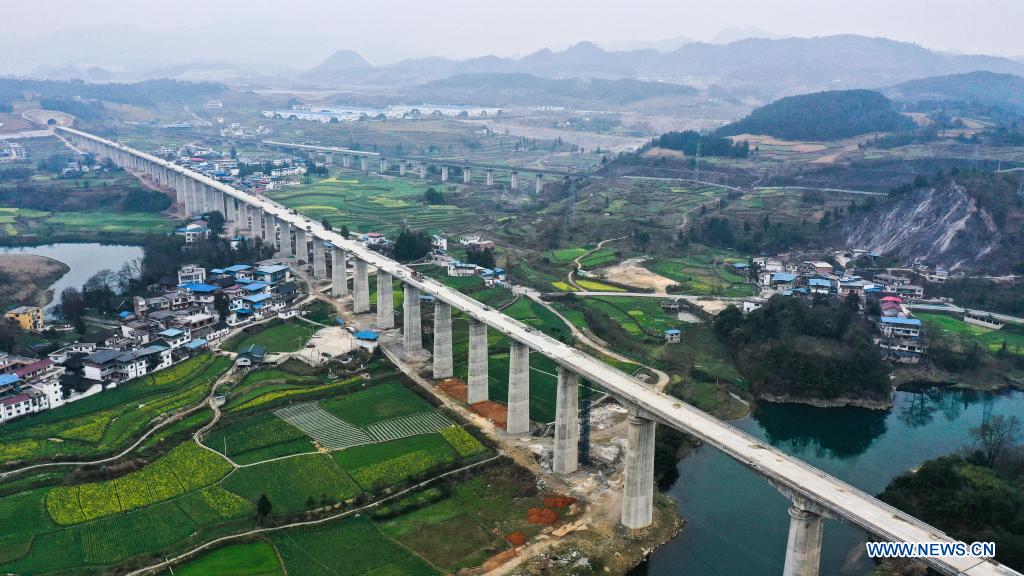 ?QIANNAN, 7 marzo, 2022 (Xinhua) -- Vista aérea del 5 de marzo de 2022 del Gran Puente del río Qingshui de Yingpan de dos carriles del ferrocarril de alta velocidad Guiyang-Nanning, en la provincia de Guizhou, en el suroeste de China. El ferrocarril de alta velocidad uniendo Guiyang, en la provincia de Guizhou y Nanning, en la región autónoma de la etnia zhuang de Guangxi, en el sur de China, está dise?ado para alcanzar una velocidad máxima de 350 kilómetros por hora. (Xinhua/Yang Wenbin)