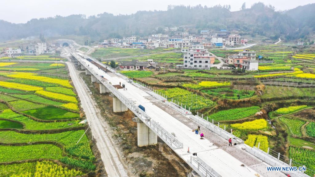 QIANNAN, 7 marzo, 2022 (Xinhua) -- Vista aérea del 6 de marzo de 2022 del sitio de construcción del ferrocarril de alta velocidad Guiyang-Nanning, en la provincia de Guizhou, en el suroeste de China. El ferrocarril de alta velocidad uniendo Guiyang, en la provincia de Guizhou y Nanning, en la región autónoma de la etnia zhuang de Guangxi, en el sur de China, está dise?ado para alcanzar una velocidad máxima de 350 kilómetros por hora. (Xinhua/Yang Wenbin)