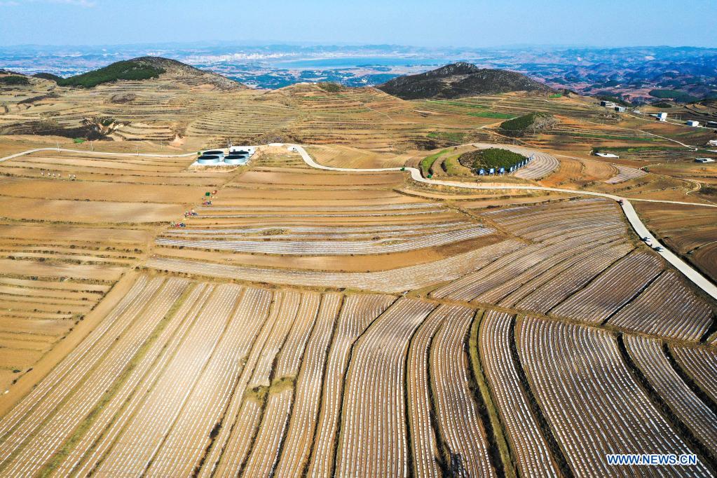 ?WEINING, 9 marzo, 2022 (Xinhua) -- Vista aérea del 8 de marzo de 2022 de agricultores laborando en los campos en Weining, en la provincia de Guizhou, en el suroeste de China. En el proceso de consolidación de los logros de alivio de la pobreza y promoción de la revitalización rural, Guizhou ha guiado activamente a los agricultores a cambiar los métodos de cultivo y desarrollar una industria agrícola adecuada en las zonas monta?osas. Al mismo tiempo, Guizhou ha hecho esfuerzos por integrar la agricultura con las industrias del turismo y la cultura, lo que ha ayudado a incrementar la eficiencia agrícola y los ingresos de los agricultores. (Xinhua/Yang Wenbin)