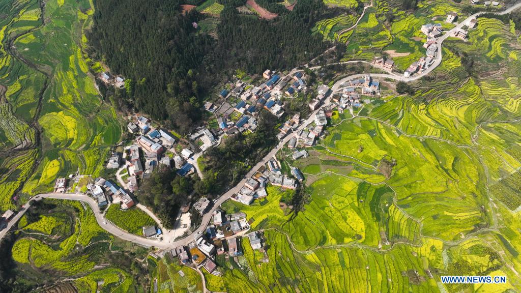 WEINING, 9 marzo, 2022 (Xinhua) -- Vista aérea del 7 de marzo de 2022 del paisaje de flores de colza en Panzhou, en la provincia de Guizhou, en el suroeste de China. En el proceso de consolidación de los logros de alivio de la pobreza y promoción de la revitalización rural, Guizhou ha guiado activamente a los agricultores a cambiar los métodos de cultivo y desarrollar una industria agrícola adecuada en las zonas monta?osas. Al mismo tiempo, Guizhou ha hecho esfuerzos por integrar la agricultura con las industrias del turismo y la cultura, lo que ha ayudado a incrementar la eficiencia agrícola y los ingresos de los agricultores. (Xinhua/Yang Wenbin)