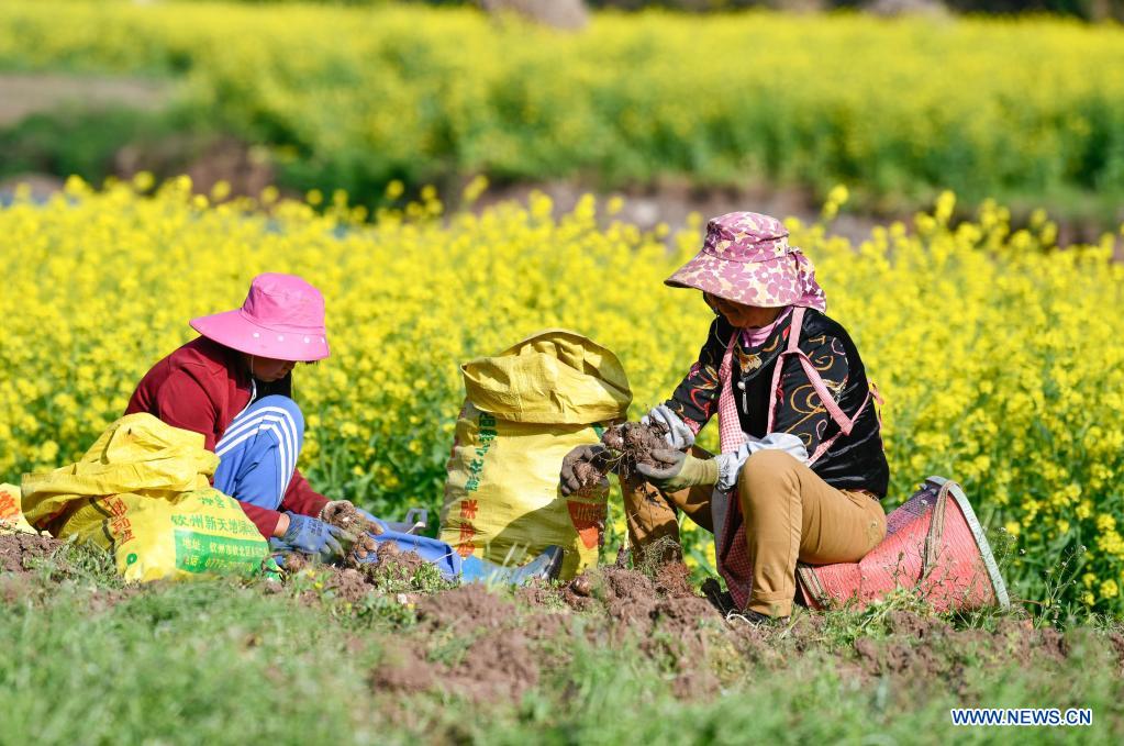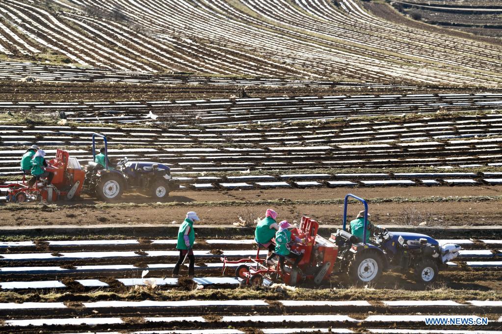 ?WEINING, 9 marzo, 2022 (Xinhua) -- Imagen del 8 de marzo de 2022 de agricultores laborando en los campos en Weining, en la provincia de Guizhou, en el suroeste de China. En el proceso de consolidación de los logros de alivio de la pobreza y promoción de la revitalización rural, Guizhou ha guiado activamente a los agricultores a cambiar los métodos de cultivo y desarrollar una industria agrícola adecuada en las zonas monta?osas. Al mismo tiempo, Guizhou ha hecho esfuerzos por integrar la agricultura con las industrias del turismo y la cultura, lo que ha ayudado a incrementar la eficiencia agrícola y los ingresos de los agricultores. (Xinhua/Yang Wenbin)