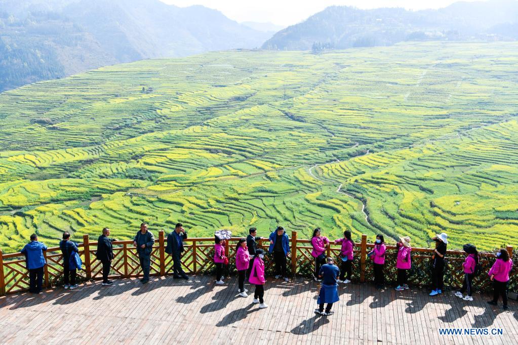 ?WEINING, 9 marzo, 2022 (Xinhua) -- Imagen del 7 de marzo de 2022 de turistas observando el paisaje de flores de colza en Panzhou, en la provincia de Guizhou, en el suroeste de China. En el proceso de consolidación de los logros de alivio de la pobreza y promoción de la revitalización rural, Guizhou ha guiado activamente a los agricultores a cambiar los métodos de cultivo y desarrollar una industria agrícola adecuada en las zonas monta?osas. Al mismo tiempo, Guizhou ha hecho esfuerzos por integrar la agricultura con las industrias del turismo y la cultura, lo que ha ayudado a incrementar la eficiencia agrícola y los ingresos de los agricultores. (Xinhua/Yang Wenbin)