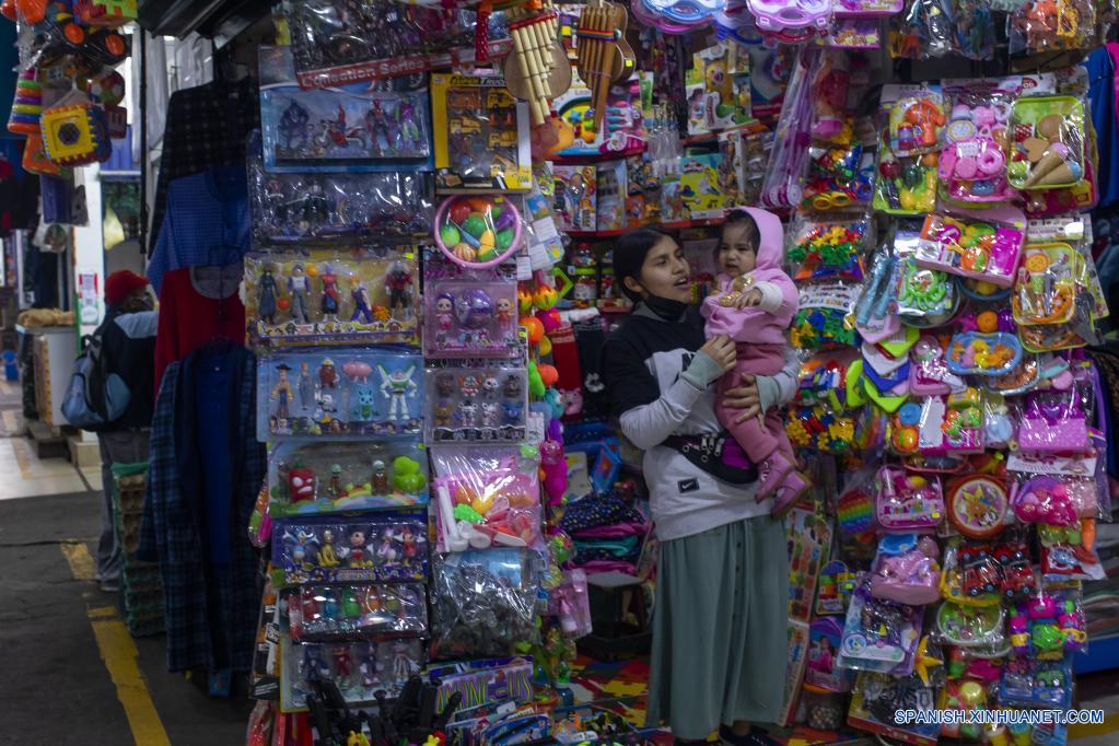 LIMA, 23 junio, 2022 (Xinhua) -- Una vendedora sostiene en brazos a una bebé mientras espera por clientes en un puesto de venta de juguetes en el Mercado de Surquillo, en Lima, Perú, el 23 de junio de 2022. (Xinhua/Mariana Bazo)