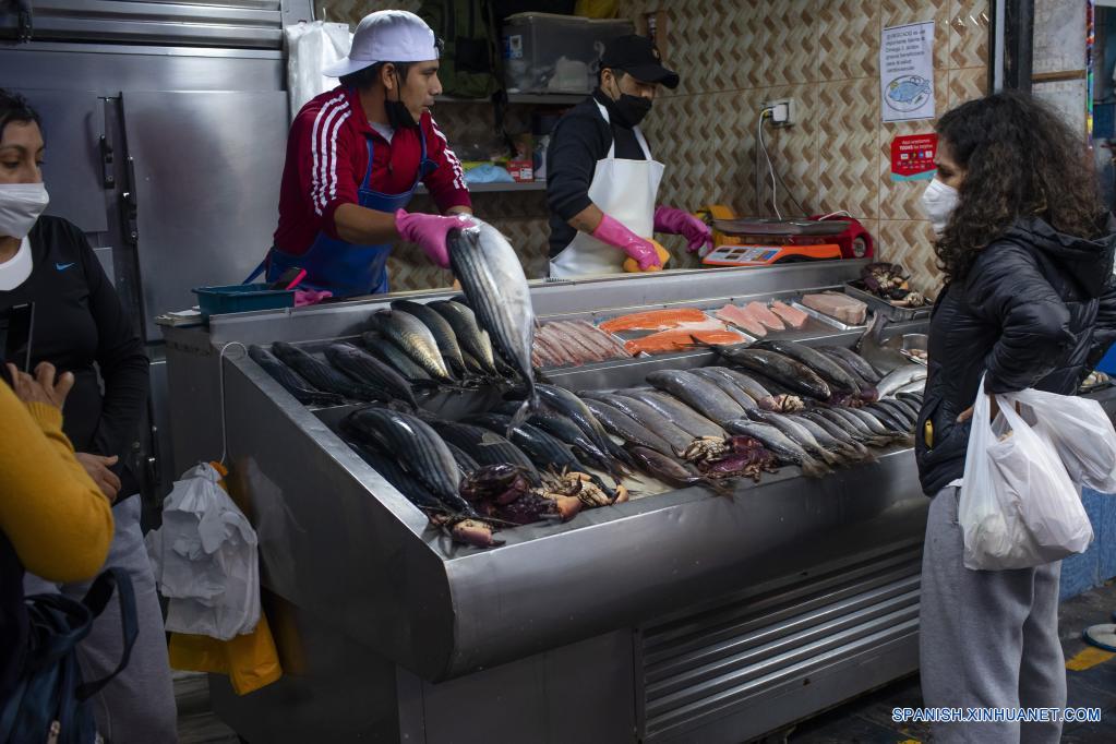 LIMA, 23 junio, 2022 (Xinhua) -- Un vendedor atiende a clientes en un puesto de venta de pescado en el Mercado de Surquillo, en Lima, Perú, el 23 de junio de 2022. (Xinhua/Mariana Bazo)