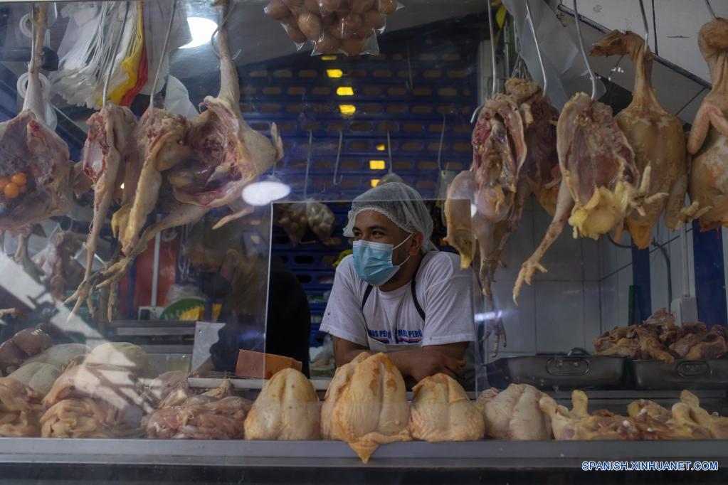 LIMA, 23 junio, 2022 (Xinhua) -- Un vendedor espera por clientes en un puesto de venta de carne de aves en el Mercado de Surquillo, en Lima, Perú, el 23 de junio de 2022. (Xinhua/Mariana Bazo)