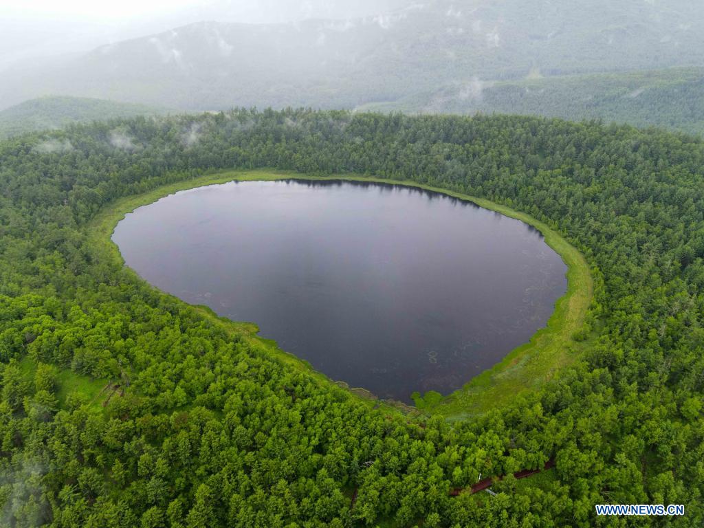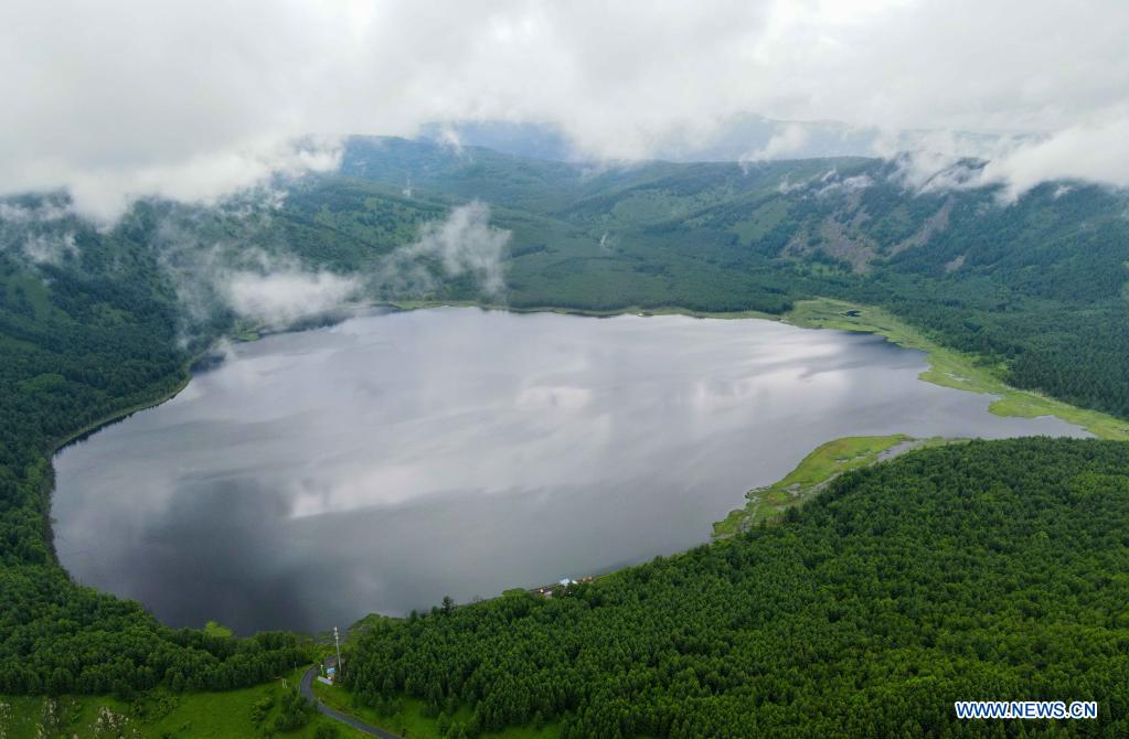 ARXAN, 24 junio, 2022 (Xinhua) -- Vista aérea del 24 de junio de 2022 del paisaje del Arxan Tianchi (Lago Celestial) en el Parque Forestal Nacional Arxan, en la región autónoma de Mongolia Interior, en el norte de China. (Xinhua/Wang Zecong)