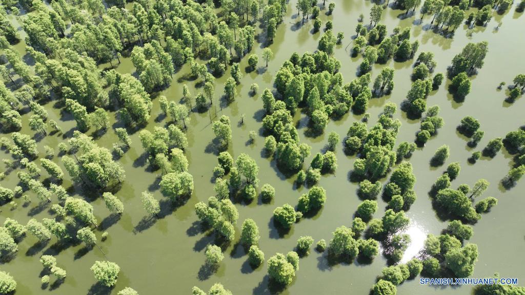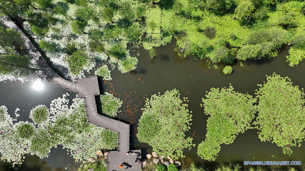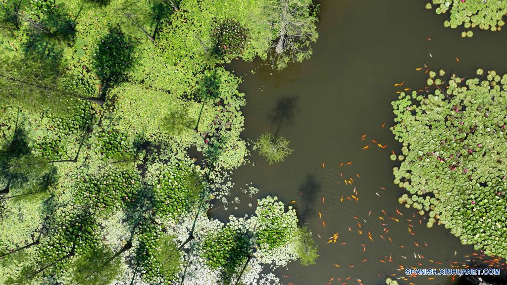 CHUZHOU, 25 junio, 2022 (Xinhua) -- Vista aérea del 25 de junio de 2022 de un paisaje del Parque Nacional de Humedales del Lago Chishan en Chuzhou, en la provincia de Anhui, en el este de China. (Xinhua/Cao Li)