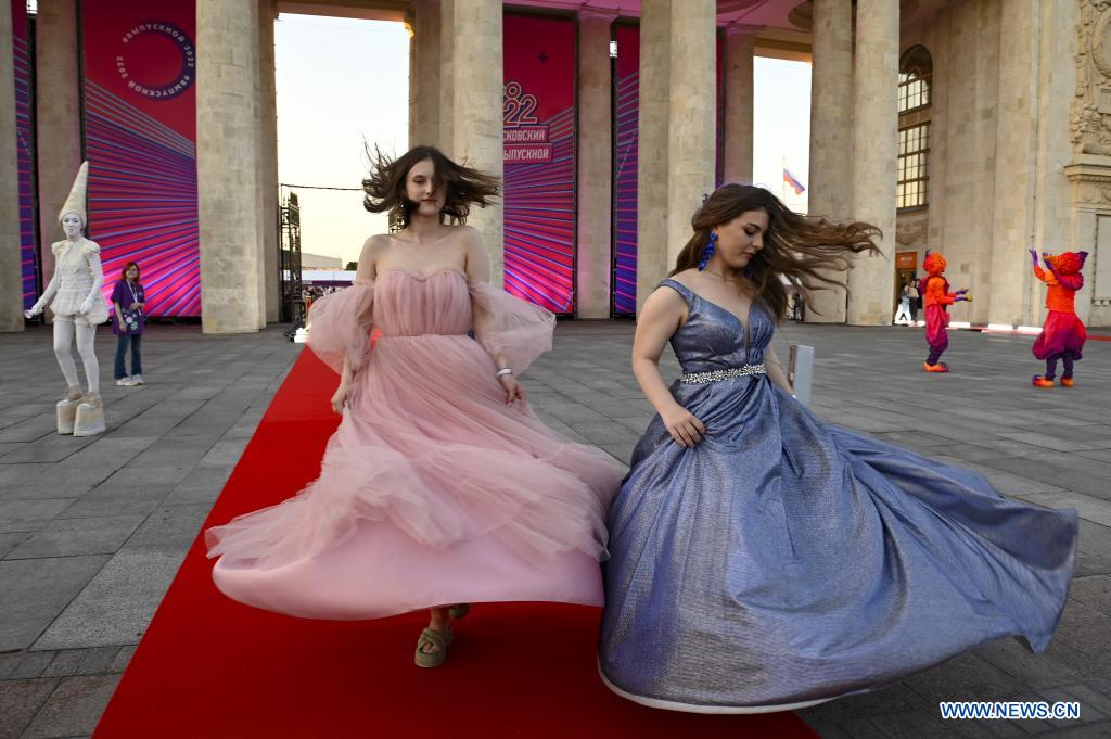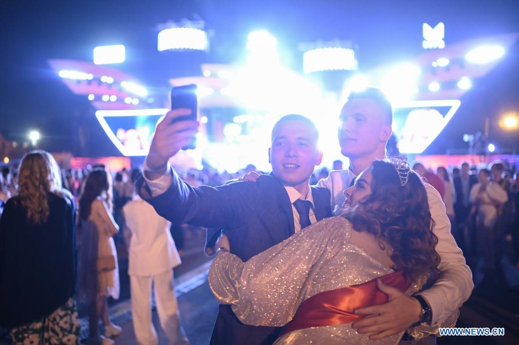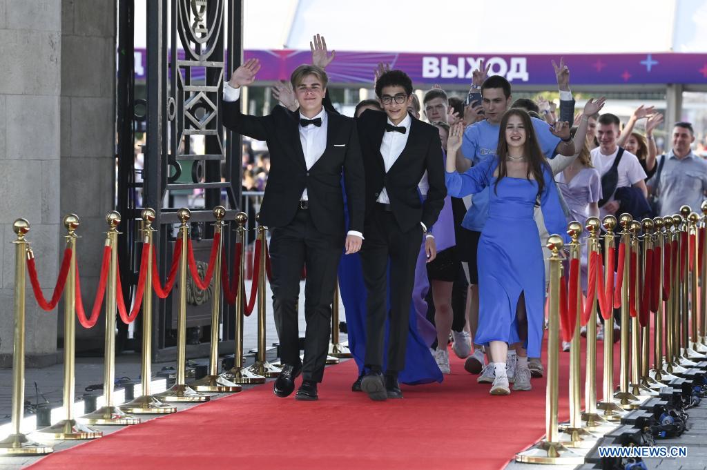 MOSCU, 26 junio, 2022 (Xinhua) -- Imagen del 25 de junio de 2022 de graduados caminando por una alfombra roja durante una fiesta de graduación, en Moscú, Rusia. La fiesta de graduación de los estudiantes de preparatoria se llevó a cabo desde la noche del 25 de junio hasta la mañana del 26 de junio en el Parque Gorki de Moscú. (Xinhua/Alexander Zemlianichenko Jr)