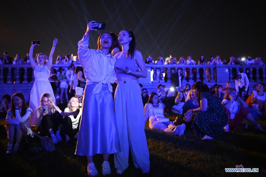 MOSCU, 26 junio, 2022 (Xinhua) -- Graduados toman fotografías durante una fiesta de graduación, en Moscú, Rusia, el 26 de junio de 2022. La fiesta de graduación de los estudiantes de preparatoria se llevó a cabo desde la noche del 25 de junio hasta la mañana del 26 de junio en el Parque Gorki de Moscú. (Xinhua/Alexander Zemlianichenko Jr)