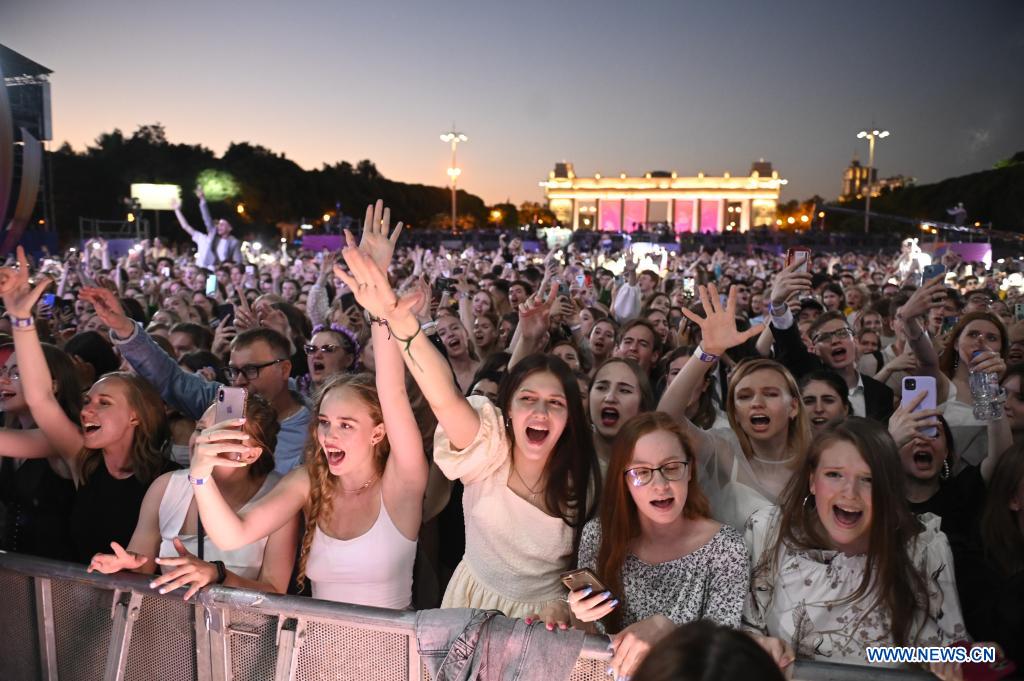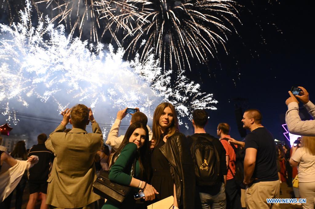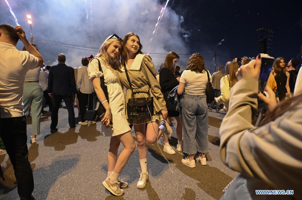 MOSCU, 26 junio, 2022 (Xinhua) -- Imagen del 25 de junio de 2022 de graduados participando en una fiesta de graduación, en Moscú, Rusia. La fiesta de graduación de los estudiantes de preparatoria se llevó a cabo desde la noche del 25 de junio hasta la mañana del 26 de junio en el Parque Gorki de Moscú. (Xinhua/Alexander Zemlianichenko Jr)