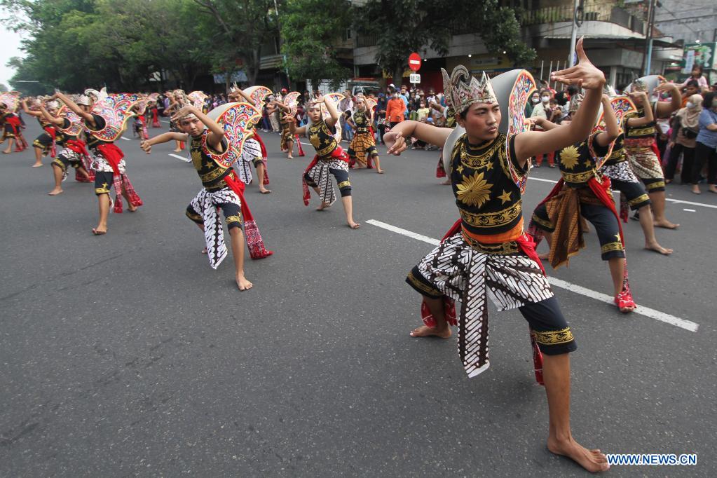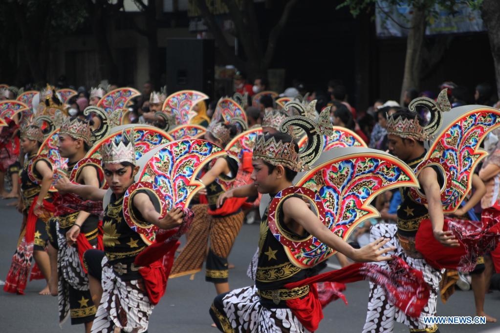 SURAKARTA, 26 junio, 2022 (Xinhua) -- Bailarines realizan una danza masiva durante un evento cultural regional, en Surakarta, Java Central, Indonesia, el 26 de junio de 2022. (Xinhua/Bram Selo)