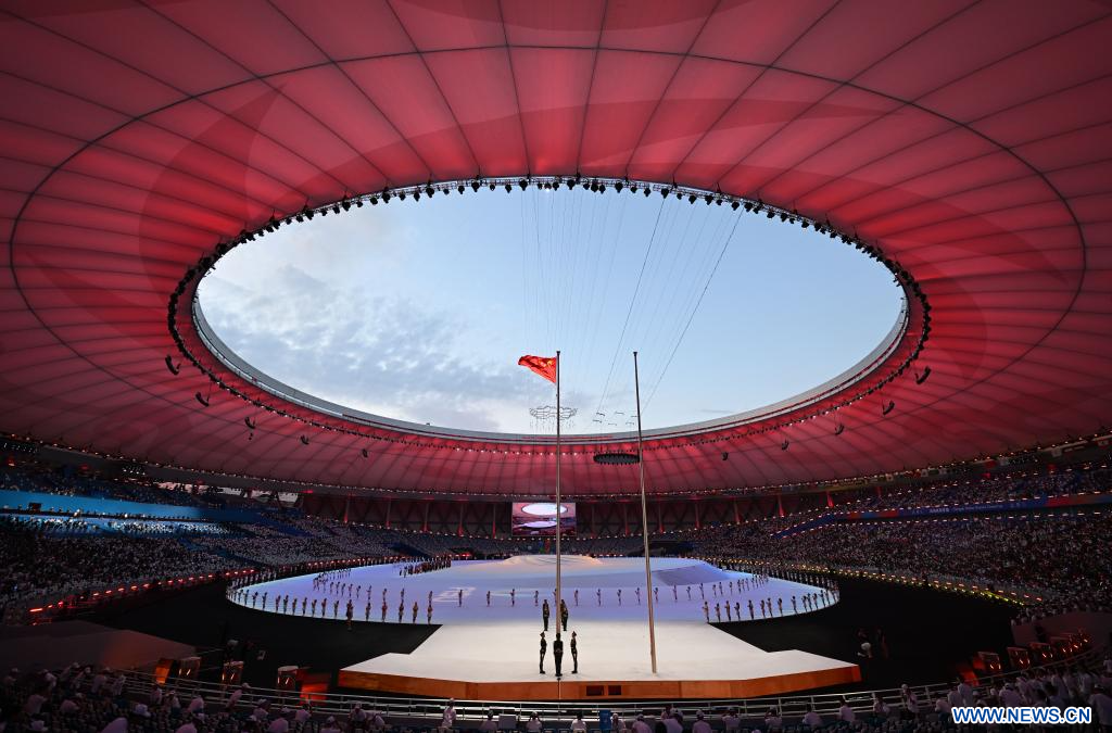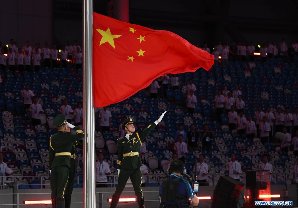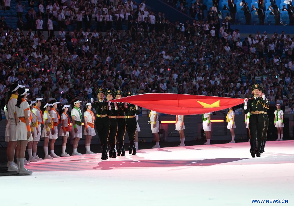 CHENGDU, 28 julio, 2023 (Xinhua) -- La bandera nacional china es izada durante la ceremonia de apertura de la 31ª edición de verano de los Juegos Mundiales Universitarios de la FISU, en Chengdu, en la provincia de Sichuan, en el suroeste de China, el 28 de julio de 2023. (Xinhua/Zhao Zishuo)