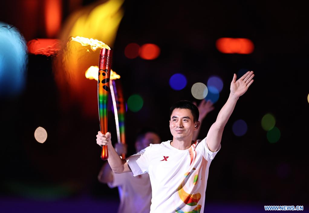 CHENGDU, 28 julio, 2023 (Xinhua) -- El portador de la antorcha, Ye Guangfu, corre durante la ceremonia de apertura de la 31ª edición de verano de los Juegos Mundiales Universitarios de la FISU, en Chengdu, en la provincia de Sichuan, en el suroeste de China, el 28 de julio de 2023. (Xinhua/Yan Qing)