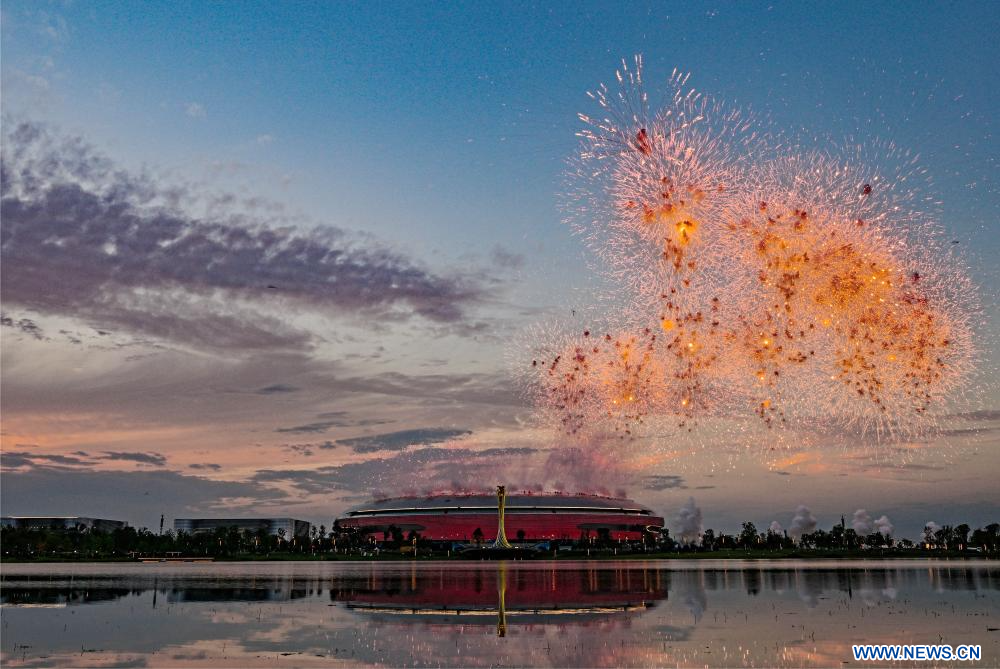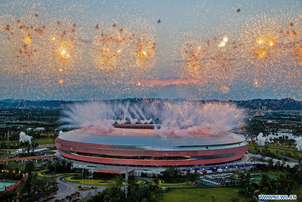CHENGDU, 28 julio, 2023 (Xinhua) -- Fuegos artificiales son vistos durante la ceremonia de apertura de la 31ª edición de verano de los Juegos Mundiales Universitarios de la FISU, en Chengdu, en la provincia de Sichuan, en el suroeste de China, el 28 de julio de 2023. (Xinhua/Yang Qing)