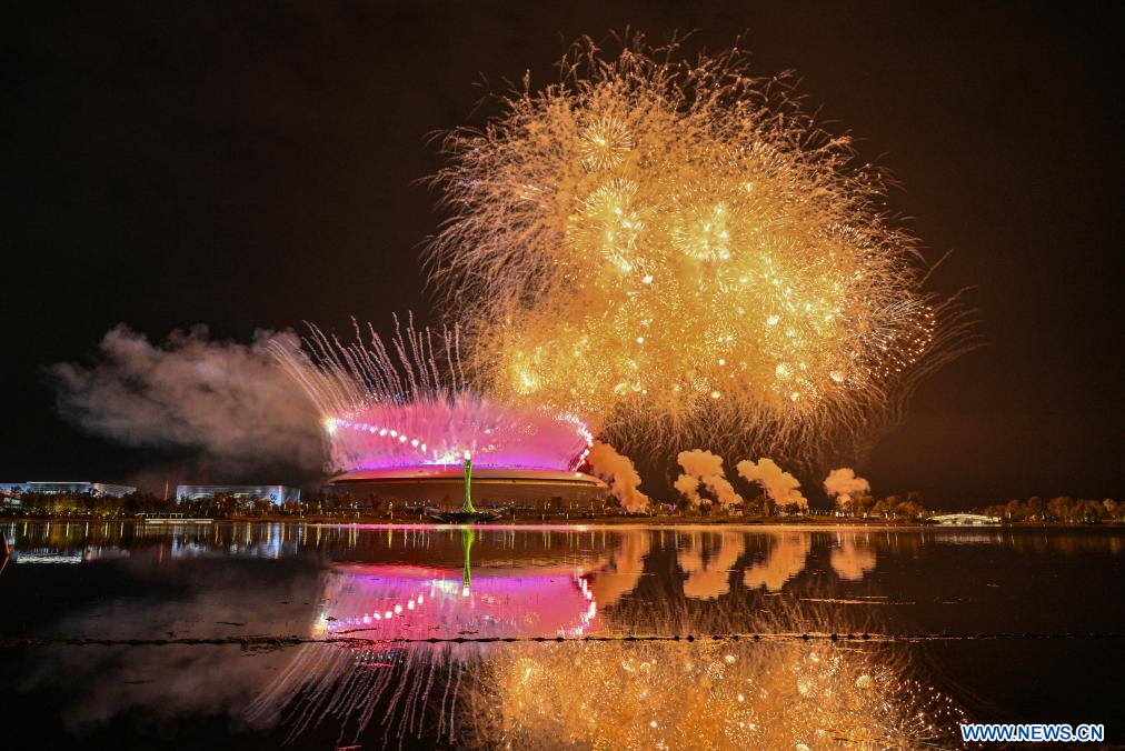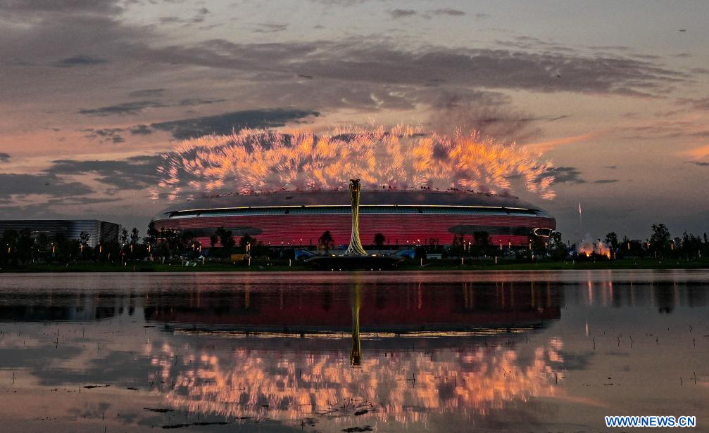 CHENGDU, 28 julio, 2023 (Xinhua) -- Fuegos artificiales son vistos durante la ceremonia de apertura de la 31ª edición de verano de los Juegos Mundiales Universitarios de la FISU, en Chengdu, en la provincia de Sichuan, en el suroeste de China, el 28 de julio de 2023. (Xinhua/Jinmei Duoji)