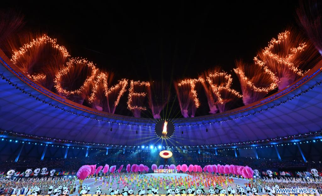 CHENGDU, 28 julio, 2023 (Xinhua) -- Fuegos artificiales son vistos durante la ceremonia de apertura de la 31ª edición de verano de los Juegos Mundiales Universitarios de la FISU, en Chengdu, en la provincia de Sichuan, en el suroeste de China, el 28 de julio de 2023. (Xinhua/Wu Gang)