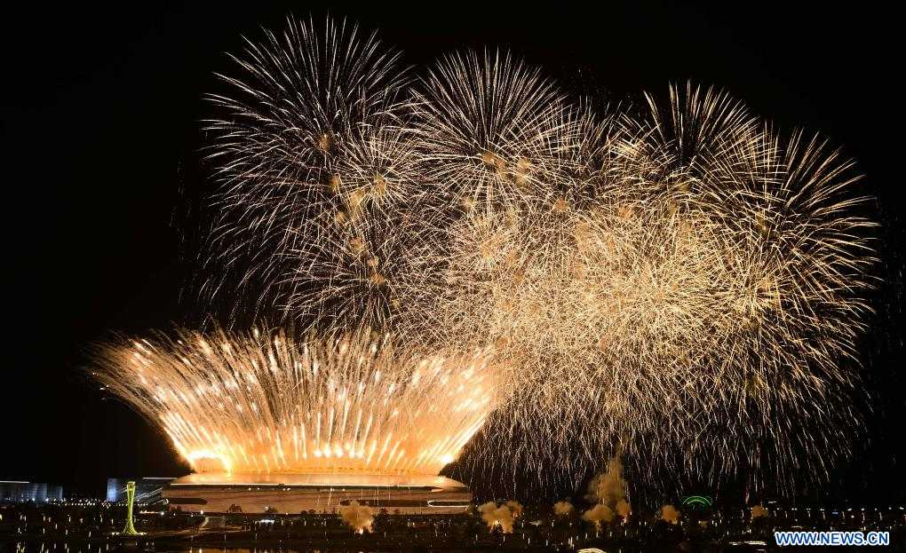 CHENGDU, 28 julio, 2023 (Xinhua) -- Fuegos artificiales son vistos durante la ceremonia de apertura de la 31ª edición de verano de los Juegos Mundiales Universitarios de la FISU, en Chengdu, en la provincia de Sichuan, en el suroeste de China, el 28 de julio de 2023. (Xinhua/Jigme Dorje)