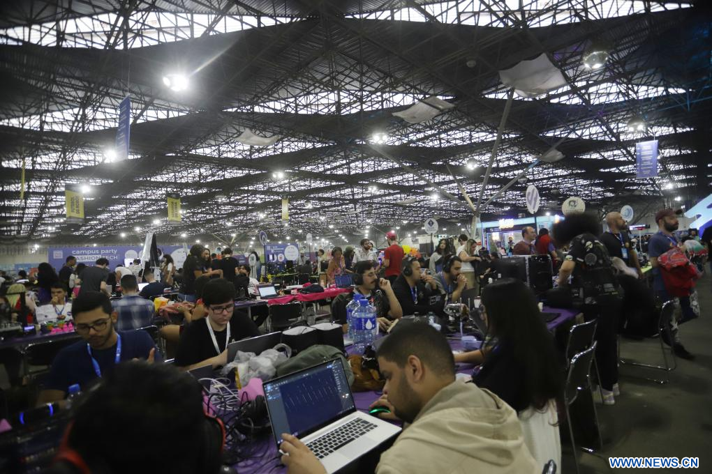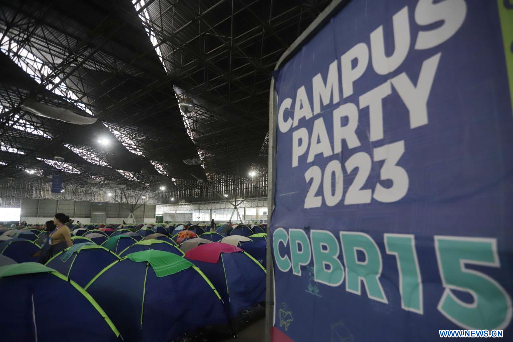 SAO PAULO, 27 julio, 2023 (Xinhua) -- Personas asisten a la 15 edición del festival de tecnología Campus Party, en Sao Paulo, Brasil, el 27 de julio de 2023. (Xinhua/Rahel Patrasso)