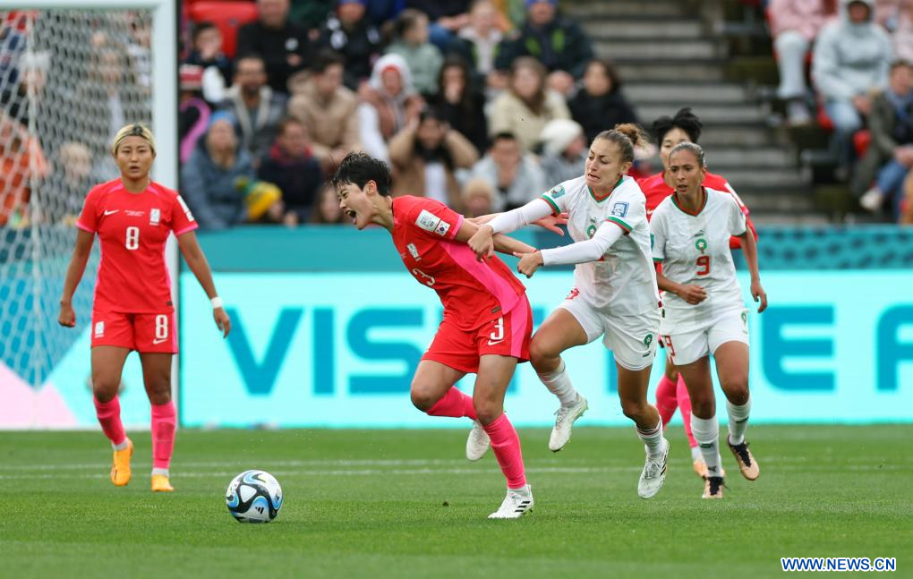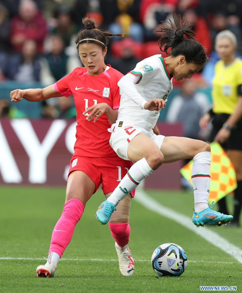 ADELAIDA, 30 julio, 2023 (Xinhua) -- Hong Hyeii (2-i), de República de Corea, compite con Elodie Nahla Nakkach (3-i), de Marruecos, durante el partido del Grupo H entre República de Corea y Marruecos en la Copa Mundial Femenina de la FIFA Australia y Nueva Zelanda 2023, en Adelaida, Australia, el 30 de julio de 2023. (Xinhua/Bai Xuefei)