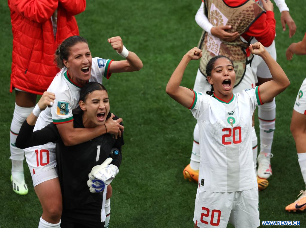 ADELAIDA, 30 julio, 2023 (Xinhua) -- Sofia Bouftini (d), Najat Badri (i), y la guardameta Khadija Er-Rmichi, de Marruecos, festejan después de ganar el partido del Grupo H entre República de Corea y Marruecos en la Copa Mundial Femenina de la FIFA Australia y Nueva Zelanda 2023, en Adelaida, Australia, el 30 de julio de 2023. (Xinhua/Zhang Chen)