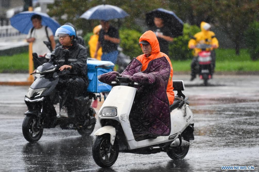 BEIJING, 30 julio, 2023 (Xinhua) -- Personas montan motonetas en medio de la lluvia, en Beijing, capital de China, el 30 de julio de 2023. Regiones del norte de China, incluidas Beijing, Hebei y Shandong, han sido azotadas por las fuertes lluvias causadas por el tifón Doksuri, el quinto de este año. (Xinhua/Ju Huanzong)
