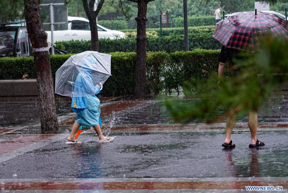 BEIJING, 30 julio, 2023 (Xinhua) -- Personas caminan en medio de la lluvia, en Beijing, capital de China, el 30 de julio de 2023. Regiones del norte de China, incluidas Beijing, Hebei y Shandong, han sido azotadas por las fuertes lluvias causadas por el tifón Doksuri, el quinto de este año. (Xinhua/Ju Huanzong)