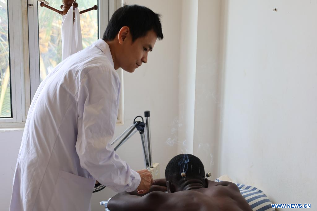 ACCRA, 27 julio, 2023 (Xinhua) -- Imagen del 24 de julio de 2023 de Chen Gao, un doctor de medicina tradicional china (MTC) del equipo médico chino en Ghana, tratando a un paciente en el Hospital de la Amistad China-Ghana, en Accra, Ghana. (Xinhua/Seth)