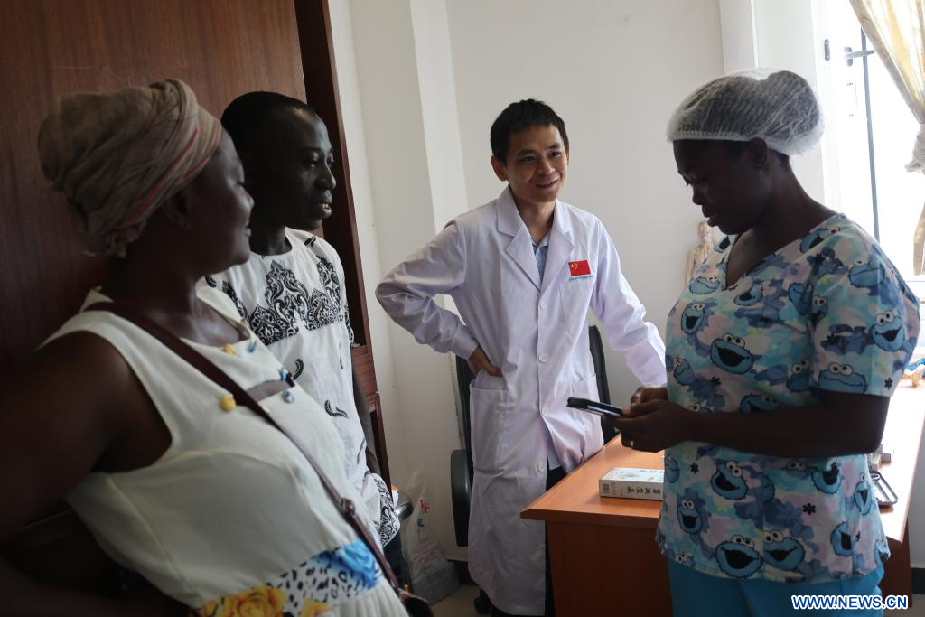 ACCRA, 27 julio, 2023 (Xinhua) -- Imagen del 24 de julio de 2023 de Chen Gao, un doctor de medicina tradicional china (MTC) del equipo médico chino en Ghana, hablando con pacientes y trabajadores médicos en el Hospital de la Amistad China-Ghana, en Accra, Ghana. (Xinhua/Seth)