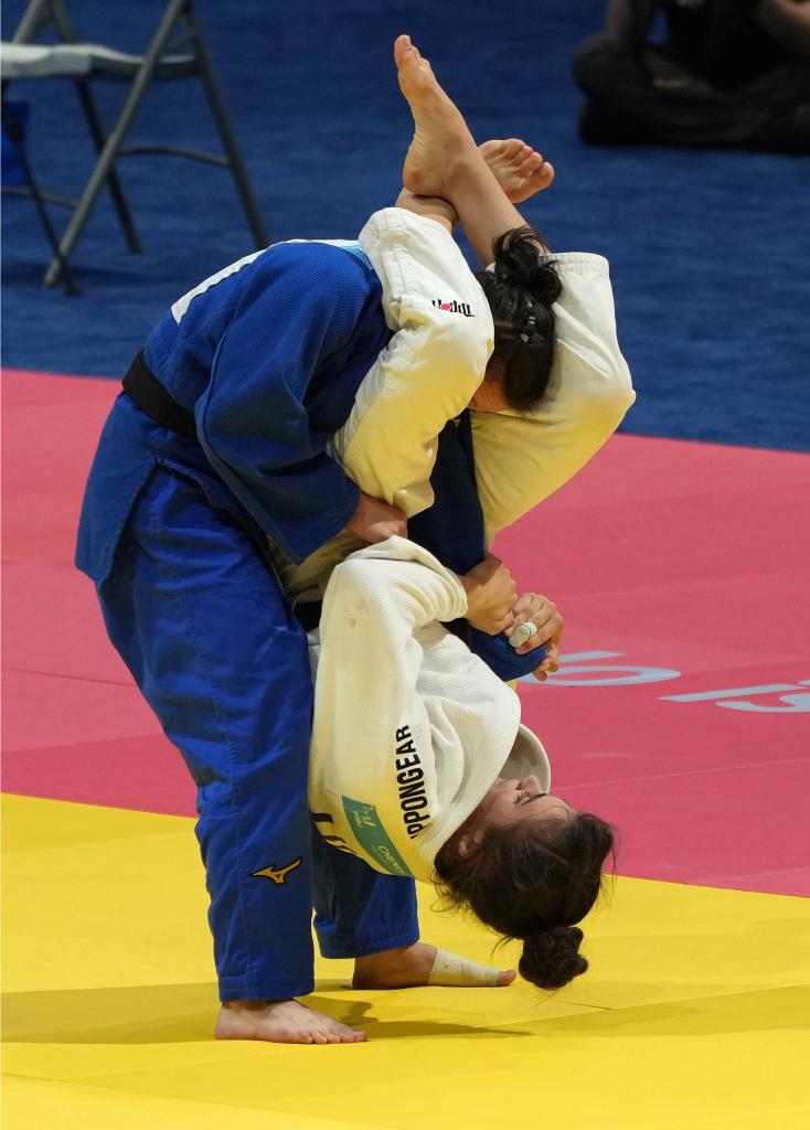 CHENGDU, 29 julio, 2023 (Xinhua) -- Gulkhayo Juraeva (i), de Uzbekistán, compite con Roza Gyertyas, de Hungría, durante las competencias por las medallas de bronce de judo femenino de 52kg en la 31ª edición de verano de los Juegos Mundiales Universitarios de la FISU, en Chengdu, en la provincia de Sichuan, en el suroeste de China, el 29 de julio de 2023. (Xinhua/Luo Xuefeng)