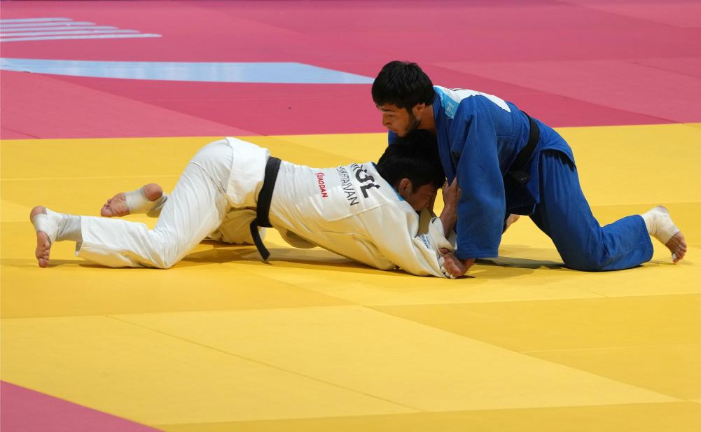 CHENGDU, 29 julio, 2023 (Xinhua) -- Kamoliddin Bakhtiyorov (d), de Uzbekistán, compite con Sumiyabazar Enkhtaivan, de Mongolia, durante las competencias por las medallas de bronce de judo masculino de 60kg en la 31ª edición de verano de los Juegos Mundiales Universitarios de la FISU, en Chengdu, en la provincia de Sichuan, en el suroeste de China, el 29 de julio de 2023. (Xinhua/Luo Xuefeng)