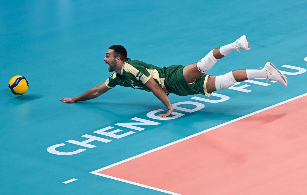 CHENGDU, 29 julio, 2023 (Xinhua) -- Goncalo Nogueira Gomes salva el balón durante el partido de voleibol masculino preliminar del pool A entre Polonia y Portugal en la 31ª edición de verano de los Juegos Mundiales Universitarios de la FISU, en Chengdu, en la provincia de Sichuan, en el suroeste de China, el 29 de julio de 2023. (Xinhua/Xu Bingjie)