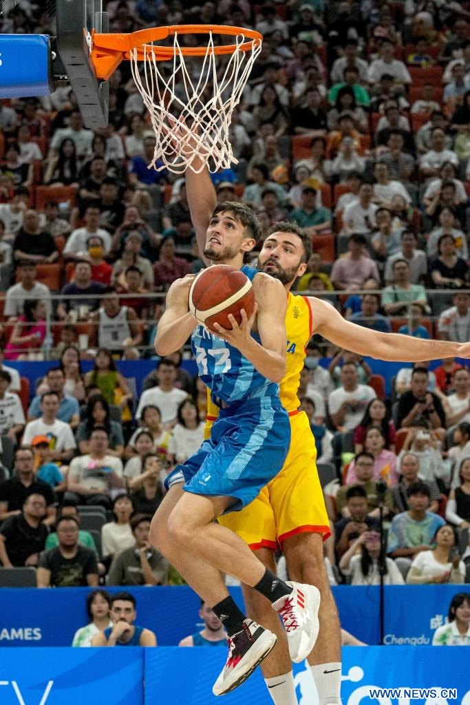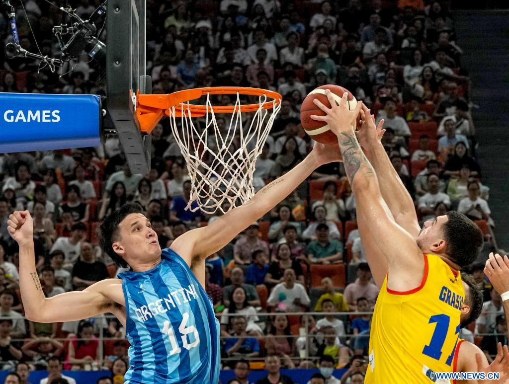 CHENGDU, 30 julio, 2023 (Xinhua) -- Sebastián Lugo (i), de Argentina, disputa el balón con Stefan Grasu, de Rumania, durante el partido de baloncesto masculino de la ronda preliminar del grupo B entre Argentina y Rumania en la 31ª edición de verano de los Juegos Mundiales Universitarios de la FISU, en Chengdu, en la provincia de Sichuan, en el suroeste de China, el 30 de julio de 2023. (Xinhua/Hu Chao)