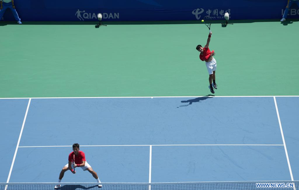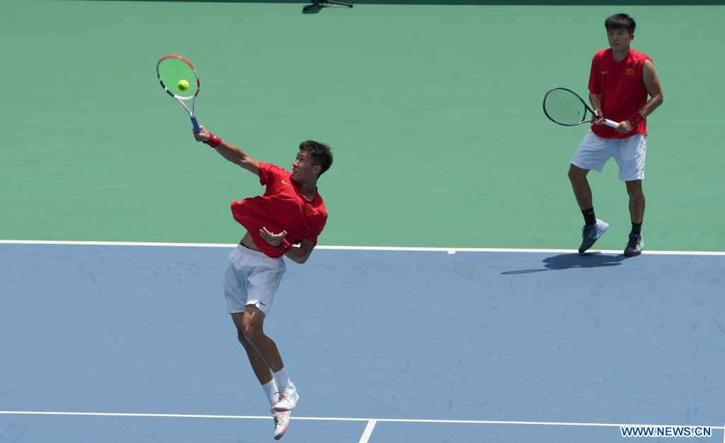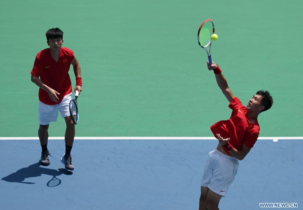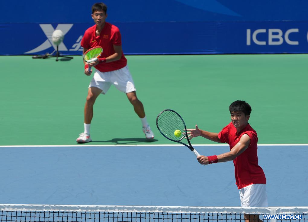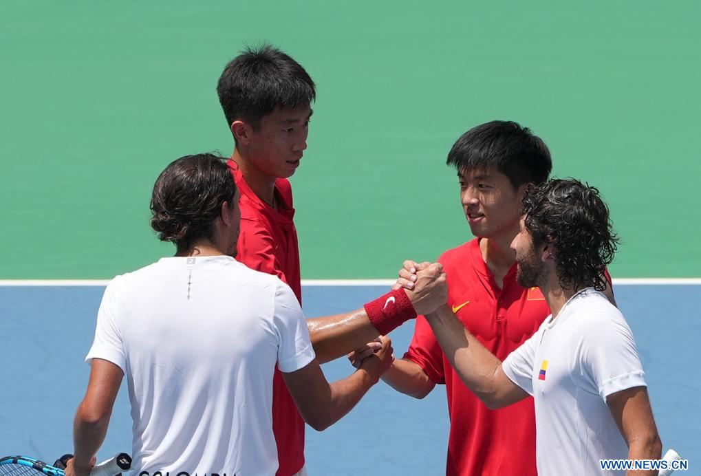 CHENGDU, 30 julio, 2023 (Xinhua) -- Gu Jin (i), y Zhao Zhao, compiten durante el partido de primera ronda de dobles masculino de tenis entre Gu Jin, y Zhao Zhao, de China, y Manuel Montoya Zuluaga, y Alejandro Moncada Marín, de Colombia, en la 31ª edición de verano de los Juegos Mundiales Universitarios de la FISU, en Chengdu, en la provincia de Sichuan, en el suroeste de China, el 30 de julio de 2023. (Xinhua/Li Jing)