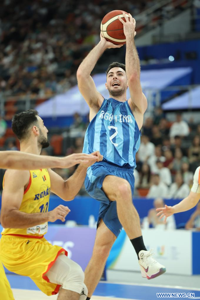 CHENGDU, 30 julio, 2023 (Xinhua) -- Mateo Chiarini (d), de Argentina, dispara durante el partido de baloncesto masculino de la ronda preliminar del grupo B entre Argentina y Rumania en la 31ª edición de verano de los Juegos Mundiales Universitarios de la FISU, en Chengdu, en la provincia de Sichuan, en el suroeste de China, el 30 de julio de 2023. (Xinhua/Yang Qing)