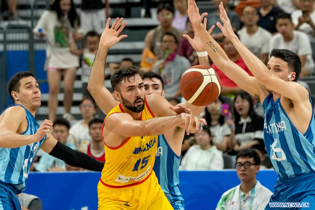 CHENGDU, 30 julio, 2023 (Xinhua) -- Emanuel Cate (c), de Rumania, pasa el balón, durante el partido de baloncesto masculino de la ronda preliminar del grupo B entre Argentina y Rumania en la 31ª edición de verano de los Juegos Mundiales Universitarios de la FISU, en Chengdu, en la provincia de Sichuan, en el suroeste de China, el 30 de julio de 2023. (Xinhua/Hu Chao)