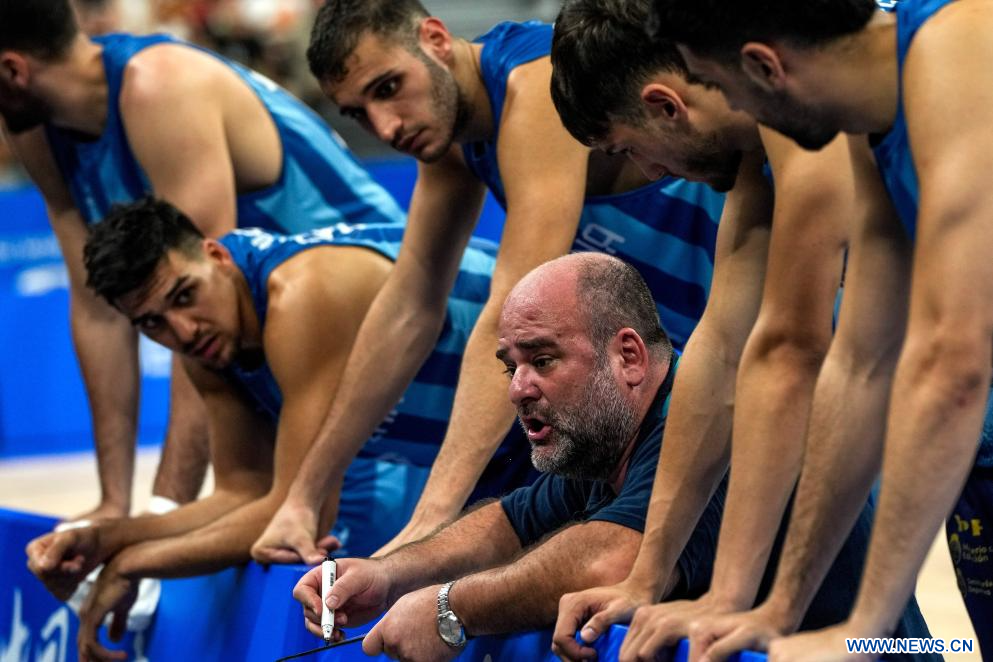 CHENGDU, 30 julio, 2023 (Xinhua) -- El director técnico, Mauricio Santangelo (c), de Argentina, conversa con jugadores durante el partido de baloncesto masculino de la ronda preliminar del grupo B entre Argentina y Rumania en la 31ª edición de verano de los Juegos Mundiales Universitarios de la FISU, en Chengdu, en la provincia de Sichuan, en el suroeste de China, el 30 de julio de 2023. (Xinhua/Hu Chao)