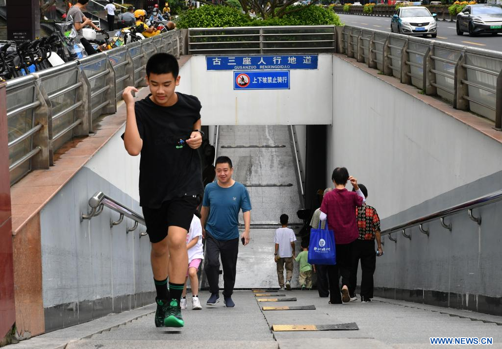 FUZHOU, 30 julio, 2023 (Xinhua) -- Ciudadanos transitan por un paso subterráneo, en Fuzhou, en la provincia de Fujian, en el sureste de China, el 30 de julio de 2023. Fuzhou ha visto cómo su vida urbana vuelve gradualmente a la normalidad después de que el tifón Doksuri afectara la ciudad. (Xinhua/Wei Peiquan)