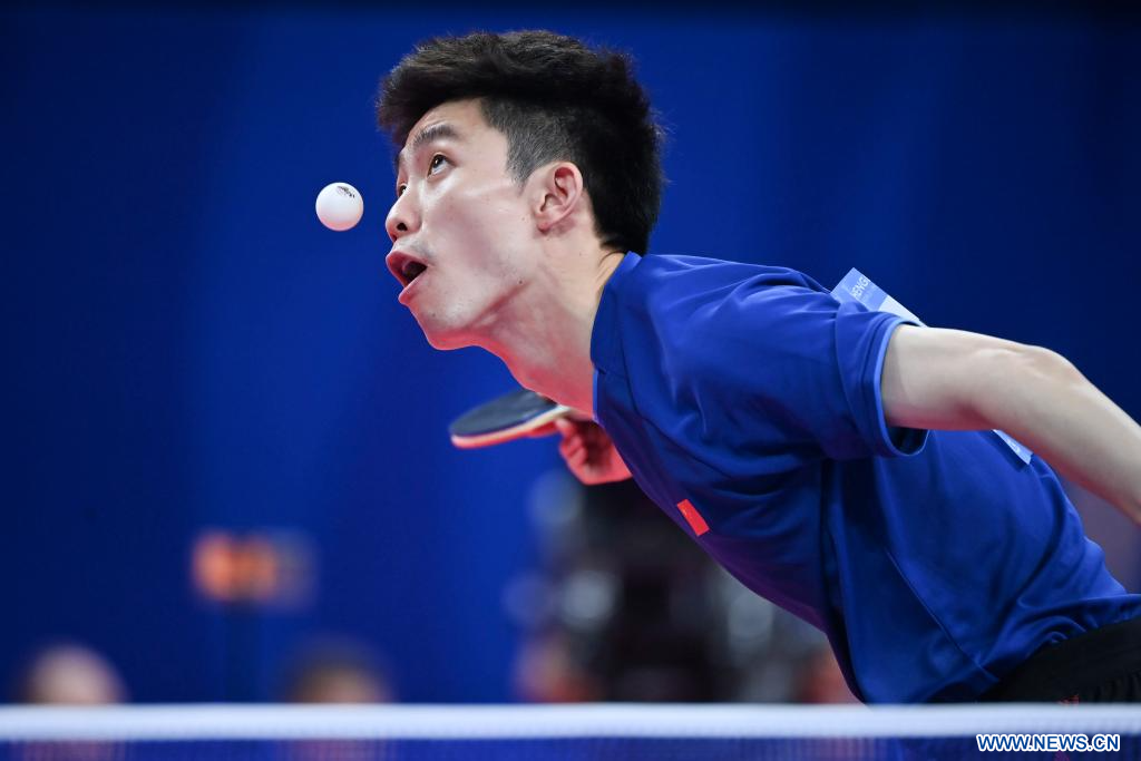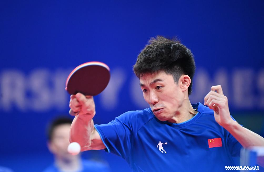 CHENGDU, 31 julio, 2023 (Xinhua) -- Zhou Kai, de China, compite con Elias Hardmeier, de Suiza, durante el partido 1 de cuartos de final masculino por equipos de tenis de mesa, entre Suiza y China, en la 31ª edición de verano de los Juegos Mundiales Universitarios de la FISU, en Chengdu, en la provincia de Sichuan, en el suroeste de China, el 31 de julio de 2023. (Xinhua/Zhao Zishuo)