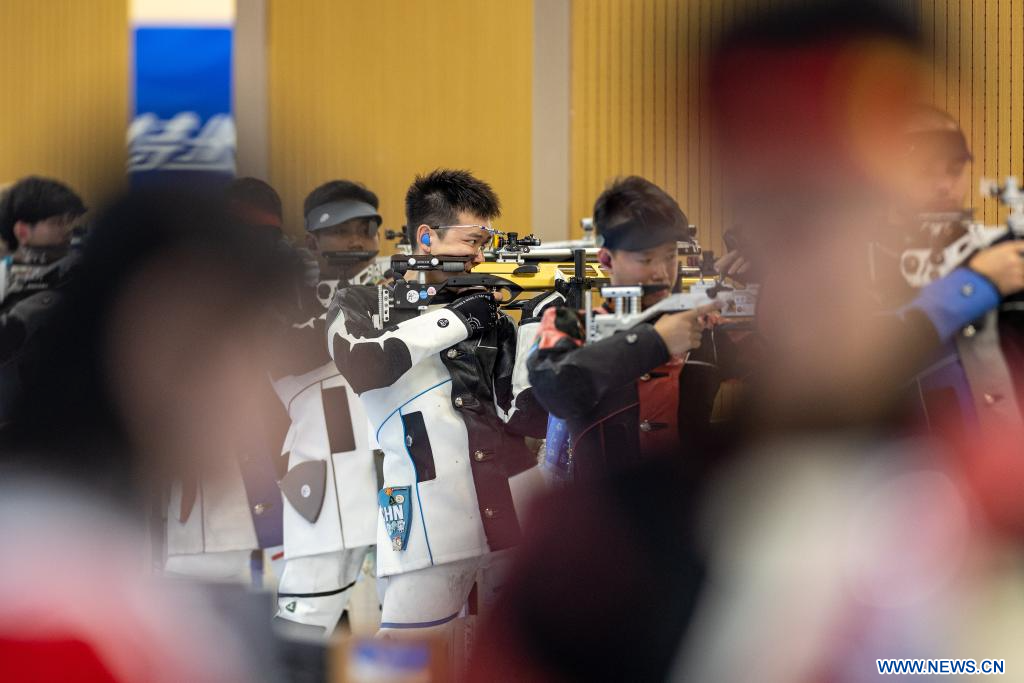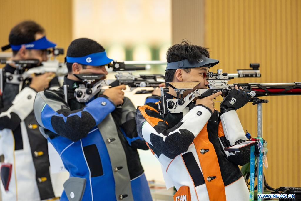 CHENGDU, 31 julio, 2023 (Xinhua) -- Li Xinmiao (c), de China, compite durante la final masculina de rifle de aire 10m por equipos de tiro en la 31ª edición de verano de los Juegos Mundiales Universitarios de la FISU, en Chengdu, en la provincia de Sichuan, en el suroeste de China, el 31 de julio de 2023. (Xinhua/Huang Wei)