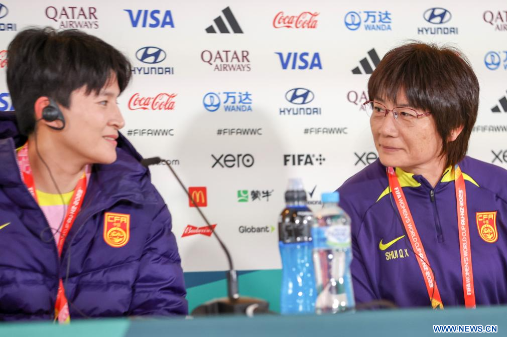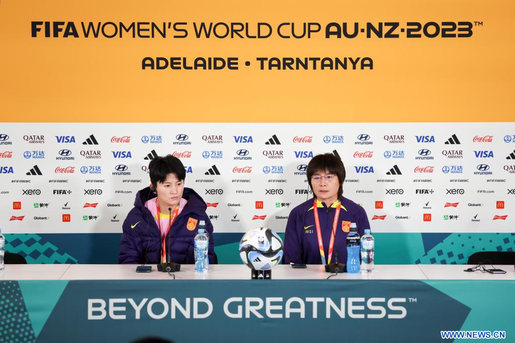 ADELAIDA, 31 julio, 2023 (Xinhua) -- La directora técnica, Shui Qingxia (d), y la jugadora Wang Shanshan, de China, asisten a una conferencia de prensa un día previo al partido del grupo D entre China e Inglaterra en la Copa Mundial Femenina de la FIFA Australia y Nueva Zelanda 2023, en Adelaida, Australia, el 31 de julio de 2023. (Xinhua/Bai Xuefei)