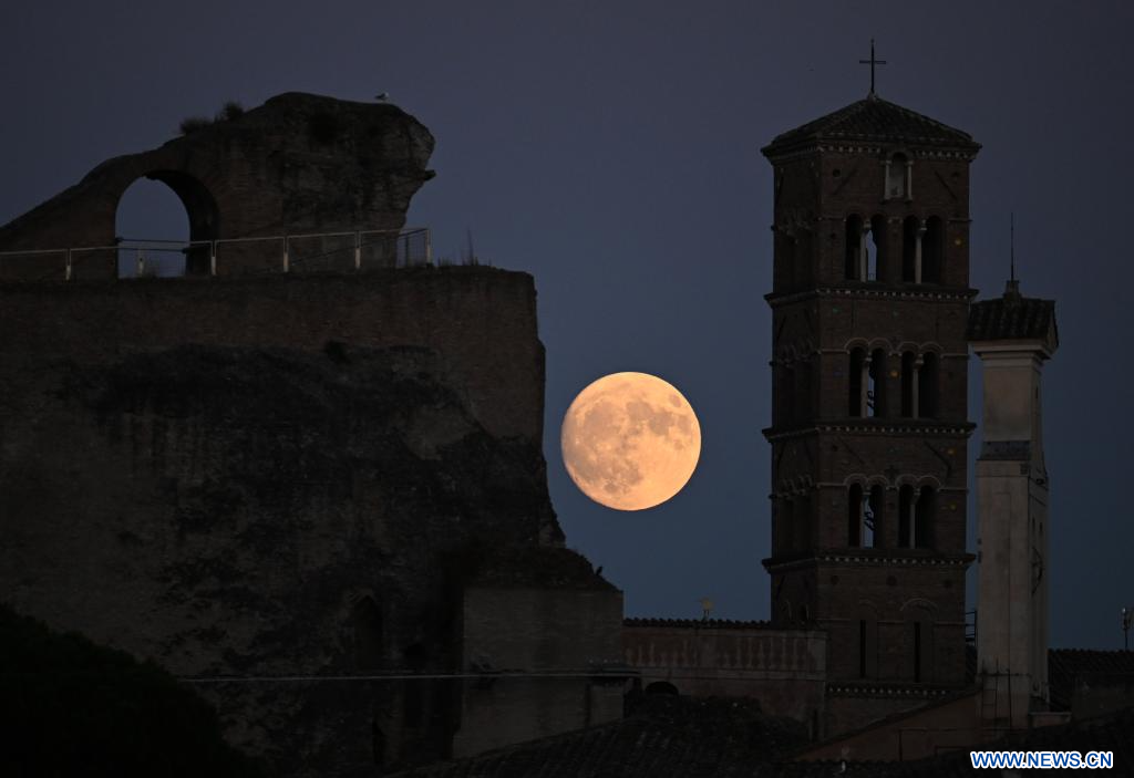 ROMA, 31 julio, 2023 (Xinhua) -- Imagen del 31 de julio de 2023 de la Luna saliendo sobre Roma, Italia. (Xinhua/Alberto Lingria)